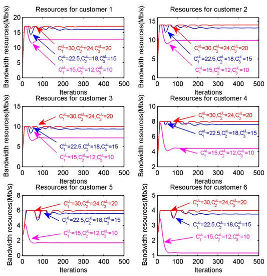 In Figure 7, we investigate the effect of different iterative step sizes on convergence speed. The six sub-figures correspond to the resource allocation for the six customers. The purple, red and blue lines in each sub-figure are regarded as resource allocation with different step sizes. We can generalize the effect of different iteration step sizes on convergence speed by comparing how fastly the lines of different colors finally converge in the sub-figure. For example, in the first sub-figure “Resources for customer 1”, the purple, red and blue lines represent the resource allocation in the case of , , , respectively. Obviously, the convergence speed is proportional to step sizes. Thus, it is essential that choosing appropriate step sizes for achieving the optimal resource allocation within reasonable iteration times.