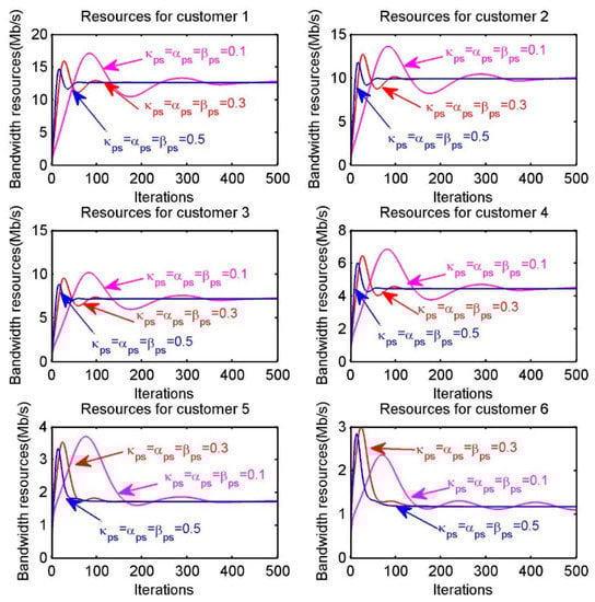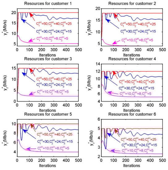 In Figure 12, we demonstrate the total bandwidth resource allocation of each customer, when different iteration step sizes are selected. For example, the first sub-figure “Resources for customer 1”, the blue curve with parameters converges at a significantly faster speed than the purple curve with parameters . Based on the previous analysis and discussion on the convergence speed, we summarize that the convergence speed mainly depends on parameters such as step sizes rather than other factors. Therefore, we can get some conclusions, on the one hand, the iteration step sizes should be small enough to ensure convergence, however, it is unnecessary that step sizes are too small to slow the speed of convergence. On the other hand, the step sizes should also be not so large that the algorithm may not converge efficiently within the neighborhood of the optimum.
