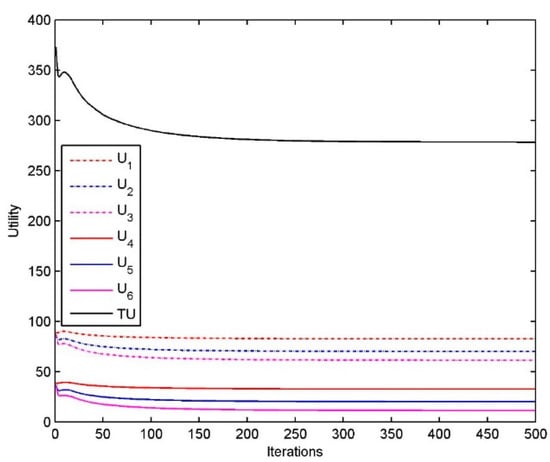 The following utility functions we use in this paper were described in the previous literatures. The Equation (2) is used to achieve a distinguished variant of utility-based fairness, which has drawn a great deal of attention and interest in recent years [40,41,42,43]. The Equation (3) is a variant of fairness, which can be reduced to the minimization of time delay and has also been receiving increasing attention [44,45].