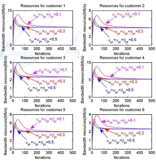 Assume that the utility functions of customers for the tasks with high requirement on latency and low requirement on processing capacity are: . Assume that the upstream capacity of provider is , the downstream capacity of customer is and the step sizes , , , . The initial rates of the resource allocation are all set to be .