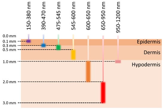 Single-wavelength, and consequently measuring at a constant depth, is one of the main aspects of PPG that limits the accuracy of SW-PPG devices when it comes to recording PPG signals in daily life. In the literature [13,14,15], it has been noted that different wavelengths can penetrate skin tissues at different depths, as shown in Figure 1. How one might effectively construct a multiwavelength PPG (MW-PPG) device, and even an all-wavelength PPG (AW-PPG) device, has attracted great attention. There is also a very interesting question, that is, what are the potential benefits of using MW-PPG or AW-PPG equipment?