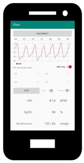 We designed a mobile app to communicate with the proposed AW-PPG device via Bluetooth Low Energy (BLE) and acquire the PPG signals in real time. As illustrated in Figure 4, we used a mobile device to assess the physiological information, such as heart rates, SpO2, and blood pressure, using algorithms developed in our previous work [20].