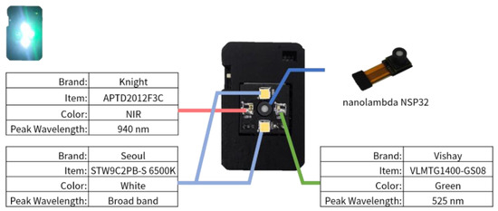 STM32F411 is responsible for controlling the spectrometer sensor and for sending the PPG data from the sensor to nRF52832. We selected the chip-scale spectrometers, NSP32 (nanolambda, Daejeon, Korea), from nanoLambda, as the AW-PPG sensor. The core technology of this sensor is based on plasmonic filters, which can be integrated into a regular photodetector such as a complementary metal-oxide semiconductor (CMOS) imager. For more details, please refer to our previous work 20. Briefly, it can be considered that the sensor is composed of many narrow-spectrum photodetectors. The advantage of this sensor is its small chip-scale size and its ability to sense the spectrum in a wide range of 400 to 1000 nm. We used NSP32 with 4 LEDs as our light source, covering broad-spectrum, to implement a portable adaptive-depth AW-PPG device, as illustrated in Figure 7.