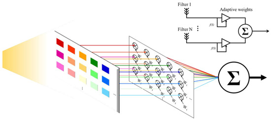 As shown in Figure 9, we measured the relationship between the signal intensity and the weights through experiments and then used a fifth-order polynomial to fit an equation, where denotes the weight of i-th filter, and denotes the signal intensity of i-th filter. This proposed method for calculating weights was easy to implement and embed in the MCU for real-time measurement. Moreover, in the literature [21], it states that there is a proportional relationship between the non-pulsatile component (e.g., DC) and the pulsatile component (e.g., AC). In other words, the signal intensity could reflect the swing amplitude of the PPG signal; the larger the signal intensity, the larger the swing amplitude. Hence, the implemented weights not only achieved the optimal in terms of signal intensity to noise ratio but could also be seen achieving the optimal signal to noise ratio in terms of the swing amplitude of PPG signals to the noise ratio.