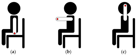 The three different postures for examining PPG measurement at different hydrostatic pressures: (a) Posture 1—hands down (−90°); (b) Posture 2—hands forward (0°); (c) Posture 3—hands up (+90°).