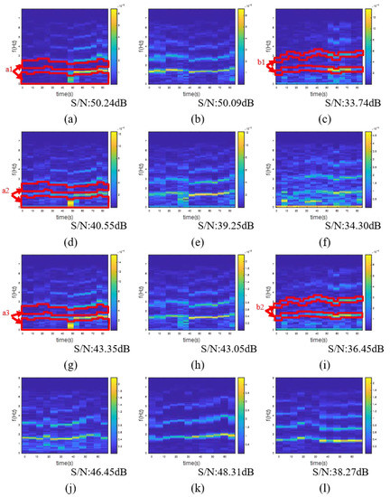 Short-time Fourier transform (STFT) of PPG signals in different postures and devices: (a) Green PPG of AFE4404EVM in hands down posture; (b) Green PPG of AFE4404EVM in hands forward posture; (c) Green PPG of AFE4404EVM in hands up posture; (d) Red PPG of AFE4404EVM in hands down posture; (e) Red PPG of AFE4404EVM in hands forward posture; (f) Red PPG of AFE4404EVM in hands up posture; (g) NIR PPG of AFE4404EVM in hands down posture; (h) NIR PPG of AFE4404EVM in hands forward posture; (i) NIR PPG of AFE4404EVM in hands up posture; (j) The proposed AW-PPG device in hands down posture; (k) The proposed AW-PPG device in hands forward posture; (l) The proposed AW-PPG device in hands up posture.