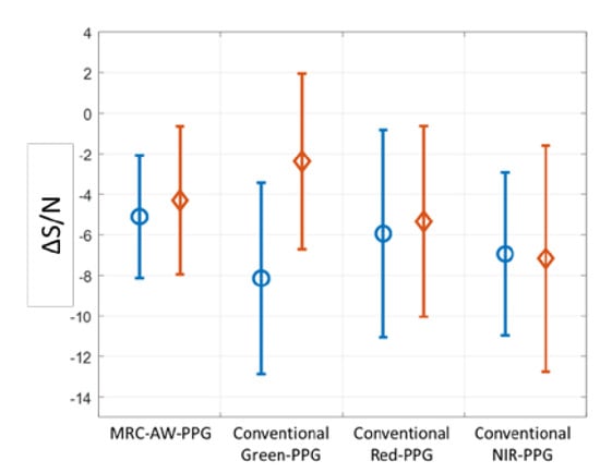 Due to the variety and complexity of skin tissue and the difficulty of maintaining consistent experimental measurements in a few cases, for example, subject 3, we observed that the performance of the proposed AW-PPG was worse than that of the TI’s device. However, it was observed that the overall performance was better in an average sense. The preliminary experimental results show that the (the difference between hands forward with hands down and hands up) of MRC-AW-PPG and conventional green, red, and NIR PPG signals are −4.30 ± 3.99/−5.10 ± 3.31 dB, −2.37 ± 4.74/−8.14 ± 5.17 dB, −5.34 ± 5.15/−5.94 ± 5.58 dB and −7.17 ± 6.11/−6.94 ± 4.40 dB, respectively, as shown in Figure 12. The MRC-AW-PPG signal gave higher adaptability in different hydrostatic pressure conditions. This inferred that although the best depth to get the clearest signal was unknown when the hydrostatic pressure was present, the AW-PPG device could record the signal of various depths and then use the MRC algorithm to combine the pulsatile signal of each wavelength, resulting in stable signals.