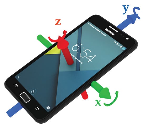 For activity recognition, multiple sensors of a smartphone can provide valuable information. Previous studies, as mentioned in Section 2, have successfully used accelerometers, gyroscopes, and barometers. Due to the low availability of barometers, this work focuses on the combination of accelerometer and gyroscope. Most sensors in Android and iOS use the same coordinate system, as shown in Figure 1. This coordinate system is typically called device coordinate system. Accelerometers measure the acceleration along the three depicted axes, mostly consisting of a static and a dynamic component:
