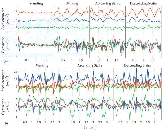 Raw sensor data sequences of the covered activities in hand-case (a) and pocket-case (b). Green, blue, and red represent the device’s local coordinate system axes x, y, and z respectively.