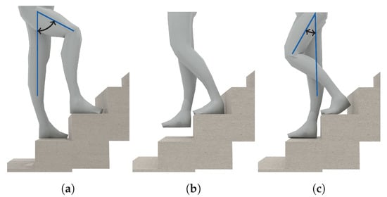Typical poses and movements exhibited while walking stairs. (a) demonstrates the high inclination typically exhibited during the ascend of stairs. (b,c) demonstrate the typically much smaller thigh inclinations during the descend of stairs.