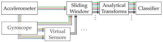 Flow diagram of the pattern recognition pipeline employed for the approach based on analytical transformations. Accelerometer and gyroscope each output the three streams x-axis (green), y-axis (blue), z-axis (red), which are processed independently throughout the pipeline until their features are concatenated for classification. Virtual sensors supply additional, artificially created, sensor channels (black). No preprocessing is required for this approach.