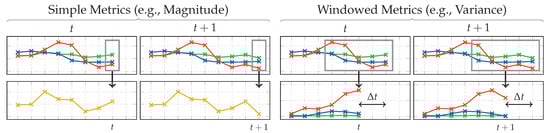 Calculation of virtual sensors for simple and windowed metrics at the example of magnitude and variance, simulated for two consecutive time-steps. For a window size of , windowed metrics have a delay of , while simple metrics such as magnitude always have a delay of .