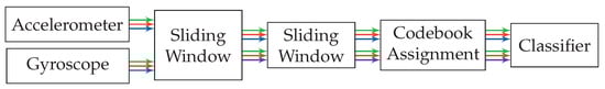 Flow diagram of the pattern recognition pipeline employed during operation of the codebook-based approach. The two sliding windows correspond to the ones employed by the codebook approach for the extraction of sequences and subsequences respectively. Accelerometer and gyroscope each output the three streams x-axis (green), y-axis (blue), z-axis (red), which are processed independently throughout the pipeline until one of the two codebook assignment strategies is used.