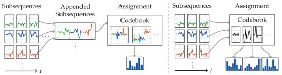 Figure 6 shows a flow diagram of the recognition pipeline employed with the codebook approach. As can be seen, the first steps are sliding windows to extract sequences of length , which are then further subdivided into subsequences of length . Instead of multiple accelerometers at different locations, we use accelerometer and gyroscope as two different sensors, though within the same location. To capture correlation between sensor channels, the authors use a strategy that appends all temporally related subsequences of all sensor channels, before assigning this composite with the codebook. This workflow is visualized on the left side in Figure 7. We instead use the strategy depicted on the right, which does not append subsequences, and instead assigns them one by one using the same codebook. In a pre-test, this strategy produced slightly better results. The biggest difference between both strategies of combined sensor channels is the number of feature vectors produced per sensor. While the strategy without appending subsequences produces the same number of feature vectors as the sensor has channels, the appending strategy always only produces one feature vector.