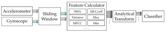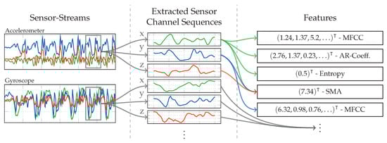 The approach’s pattern recognition pipeline is shown in Figure 4. It uses the raw incoming sensor data of gyroscope and accelerometer, of which all sensor channels (x-, y-, and z-axis) are handled independently. On each of the sensor channels, a sliding window is used to extract sequences. All of these separate sliding windows are synchronized across sensor channels. All associated windows extracted at one point in time on the stream will in the following be summarized under the term time-window. One analytical transformation is used per sensor channel, resulting in six unique transformations when gyroscope and accelerometer provide three channels each. Each of these analytical transformations is used on the raw sequences of sensor data, which were extracted using the sliding window on each sensor channel. These transformations significantly reduce the dimensionality of the sequences, extracted from their respective sensor channels, and at the same time provide the potential of improving separability.