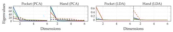 The first experiment for the approach based on analytical transformations is a preliminary examination of the eigenvalues to be expected, when separately training the transformations on hand- and pocket-case dataset, as described in Section 4.1. This was done using a window-length of 100 samples (≊), as suggested by [,]. The resulting 10 most significant eigenvalues of both PCA and LDA, when calculated on raw accelerometer (solid lines) and gyroscope (dashed lines) channels, are shown in Figure 10. In case of the PCA, eigenvalues represent the variance along the corresponding eigenvector axes. As discussed in Section 4.1, normalizing the sensor channels’ variances is not necessarily required, but was done here, to allow comparisons between channels. This, however, prevents meaningful comparisons between transformations and cases. From a look at the graphs, a reduction to at most 5 dimensions seems reasonable.