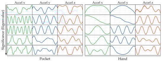 Next, a quick examination of the eigenvectors trained in the previous experiment was done, to get a look at the basic shapes used to assemble encountered sequences during operation. Figure 11 shows the 5 most significant eigenvectors trained using the PCA for each accelerometer channel and both pocket-case and hand-case. The exhibited shapes look very similar to sine waves with different scaling overall, while some eigenvectors look like a combination of multiple sine waves. More prominent in the pocket-case, some eigenvectors contain irregularities and asymmetries in the vectors. Just like the codewords in a codebook, the eigenvectors contain barely any noise, which suggests that a filter is unnecessary for acceleration. For this setup, the PCA thus behaves similar to a Fourier transform, except that it is not reconstructing signals using simple single sine waves, but combinations of them instead. The eigenvectors exhibited for gyroscope channels look fairly similar and were thus not presented here for a lack of space.