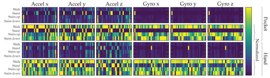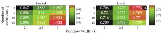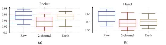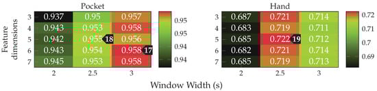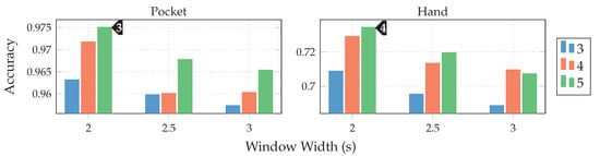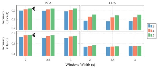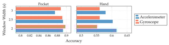Both gyroscope and accelerometer were first tested in isolation for pocket-case and hand-case, which helps to determine their roles. In pre-tests, the PCA performed better than the LDA, the tests shown in Figure 12 were thus done with the PCA, and a reduction to 5 dimensions. As can be seen in Figure 12, accelerometer and gyroscope tend to perform similarly in the pocket-case when using 5 dimensions. At a lower dimensionality, however, the gyroscope takes a strong leading role here, which would be in accordance to the discussions from Section 3.2, as well as the findings in [,]. Significant is the bad performance of both sensors for the hand-case, with the accelerometer still being better than the gyroscope. This also fits the mentioned discussion above. Differences between the tested window widths of , however, were hardly noticeable, with a very light tendency of a decreasing accuracy with higher widths.