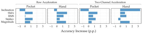 As can be seen in the features listed in Table 2, some are calculated on sensor channels such as Accelerometer Magnitude, or Inclination Gradient, which do not actually exist in hardware. These streams are computed on the fly while calculating the actual feature on them, very similar to the virtual sensors concept. Thus, Magnitude and Inclination were adopted as presented in Section 4.1 for the approach based on analytical transformations. Additionally to these, the gradient sensor, which calculates the difference between two consecutive samples per channel of the incoming signal, was added. The selected features presented in Table 2 are a collection of the best performing ones, gathered from a large set of research on activity recognition. A good overview of commonly used features for accelerometer signals can be found in [], while [,] provide a general overview of features used in a large set of publications for multiple sensors. The following will give a more in-depth view of the features we chose, as well as implementation details where appropriate.