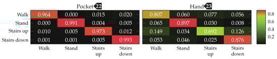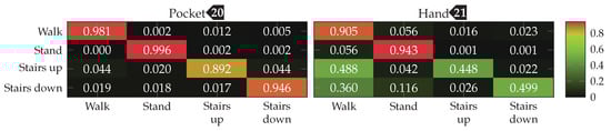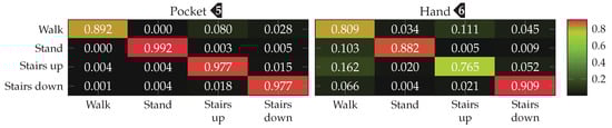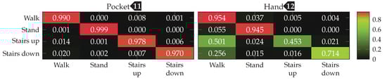 Finally, the analytical transformations-based technique was tested on the combined dataset, containing data for both pocket-case and hand-case. This test was done with the configuration shown in Table 3, while using an SVM classifier with the RBF kernel. The subset used for training was chosen evenly distributed, such that all activities had a representative set of samples with equivalent size. The overall accuracy was improved by including slightly more samples for the hand-case, than for the pocket-case. After the model has been trained with this combined training dataset, the both cases were evaluated independently. The resulting confusion matrices for both cases are shown in Figure 28. With %(%)