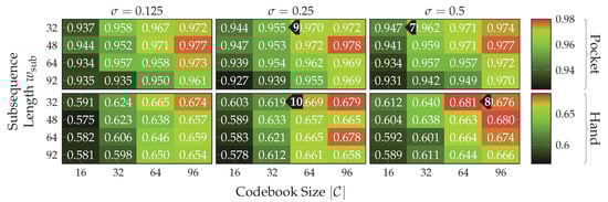 Multiple variants for the assignment of sequences to a codebook exist. As [] suggest, we use Soft Assignment, which has shown better general versatility. Additionally, the codebook approach has a couple of hyperparameters. These are the width of the extracted sequences with the corresponding step size, the width of extracted subsequences with the corresponding step size, as well as the codebook size . For the Soft Assignment strategy, there additionally is , which controls the Kernel Density Estimation’s smoothness. The parameters and have to be chosen with respect to use-case and dataset, which will be done as part of the evaluation. To reduce computational complexity, we used a fixed step width of samples for subsequences , which was determined empirically. The outer sequences , which are divided into subsequences during operation, are not moved freely, but instead moved by a multiple of this subsequence step width. The length of sequences is thus not given in samples directly, but instead implicitly determined through the number of subsequences contained. The step width used for sequences is then given by , which moves sequences th of their contained subsequences forward per time step. This alignment of sequences to the contained subsequences can in production be used to reduce computational complexity, since codebook assignments have to be done only once per subsequence, which can then be reused for 4 consequent sequences. Many approaches in the context of activity recognition use a step width in the same order of magnitude [,,,,]. The smaller this step width for sequences, the smaller the delay of the approach, but the higher the computational complexity. The actual sequence length can then be calculated using: