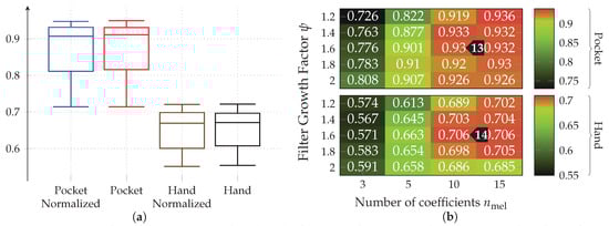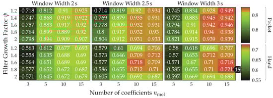 MFCC is a set of features calculated in the frequency domain, widely used for audio fingerprinting []. The use of features in frequency domain has long been avoided by research on activity recognition, since its calculation was very costly and impractical on old smartphones. Instead, some publications used rough approximations of the examined base frequencies by counting peaks [] or calculating the times between peaks [,]. On more modern smartphones, features in time domain are less problematic, which is why they will be used in this work in form of the MFCC features. Using a multi-dimensional feature in frequency-domain could prove helpful for the detection of non-periodic behavior in the sensor data. Since, while periodic movement with a consistent frequency produces a clean frequency spectrum with few and very significant peaks, un-periodic behavior tends to produce chaotic frequency spectra without peaks. MFCC feature calculation is configured using the two hyperparameters and , controlling amount and growth of the filters in the used filter-bank respectively. Determining appropriate values for these hyperparameters on the given datasets is done as part of the evaluation.
