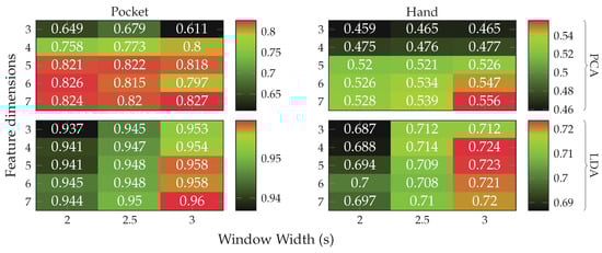Next, the full approach, including the virtual sensors described in Section 4.1, was run for a set of different window widths, as well as amount of dimensions to which the data is reduced. The results of this test, using both PCA and LDA on pocket-case and hand-case are shown in Figure 13. In this setup, the approach achieved an average classification accuracy of %(%)