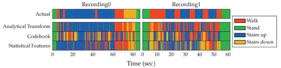 Recording1 shows the walk on stairs with large plateaus between the stair segments. Here, all approaches perform poorly, which is expressed by strong fluctuations of the detected activity in the graph. However, while our novel approach mainly cannot decide between walking and climbing stairs, the other two approaches also show misclassifications for the stair descend activity. This large number of fluctuations is mainly due to the boolean decision for only one class using SVMs. When instead training a set of SVMs for class probabilities, these decisions are less pronounced []. For both recordings, these observations coincide with the general problems of distinguishability between locomotion activities in the hand-case, which were discussed in Section 3.