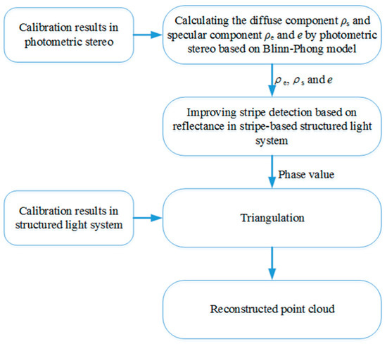 To the best of our knowledge, our work is the first to address the reconstruction problem of complex objects by combining stripe-based structured light technique with photometric stereo. We decompose the problem of complex scene reconstruction into the small problem of using reflectance information to optimize stripe detection. Based on the error analysis of stripe detection and our proposed method, a new feasible scheme is provided for the reconstruction of complex scenes. The flowchart of the proposed 3D measurement system is shown in Figure 1.