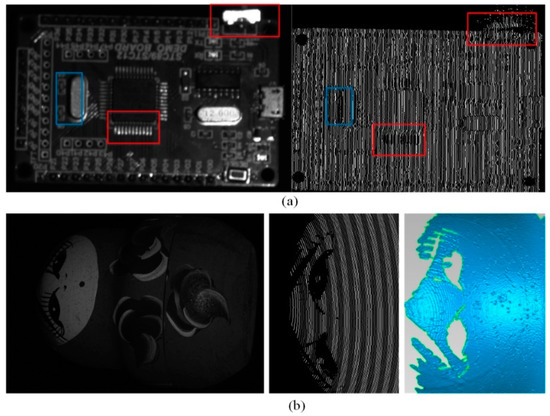As shown in Figure 5a (red box), the specular area is over-exposed with an all-white pattern projected. Thus, the coding information is missed, which results in the hole in the reconstruction results. Meanwhile, in Figure 5a (blue box), due to geometrical occlusion, the shadow also results in missed detection. The other example is shown in Figure 5b. Because the black area absorbs most of the incident light, the profile of the stripe is missed. The reconstructed surface has an apparent hole. In addition, for transparent or translucent objects, the incident light passes through the surface and little light is reflected, which also leads to missed detection. In this paper, we are not involved in the reconstruction problem of transparent or translucent objects.