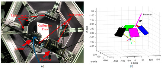 Our hybrid system consists of a monochrome camera (Point Grey-Blackfly S, with a resolution of 2448 × 2048), an industrial projector (TI-DLP4500, with a resolution of 912 × 1140) and six area light sources. The six area light sources are placed on a circular plane centered on the camera. The camera and projector are triggered synchronously by the trigger wire. The camera and area light source are triggered by a single-chip system. The working distance of the system is 35 to 45 cm and the working range of the equipment is 40 × 30 cm. The calibration methods in [37,39,40,41] were used to calibrate structured light system and area light source, respectively. The hardware system and calibration results are shown in Figure 7. In addition, a three-step phase-shifting algorithm in [29] was implemented and the reconstruction results and comparisons were also given. The phase-shifting pattern is set to have a period of 32 pixels and be shifted twice. For each pixel (x, y) in the camera image, the phase value can be calculated as: