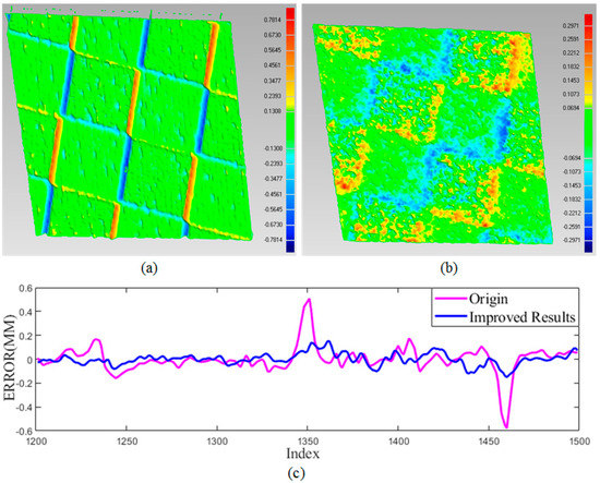 Firstly, a checkerboard with texture was reconstructed to verify that our proposed method would reasonably reduce the effect of texture on stripe detection. The results are illustrated in Figure 8 and Table 1. The normalization method cannot eliminate the effect of surface texture on stripe detection. An obvious error near the boundary is introduced with the maximum error 0.5077 mm and the minimum error −0.5781 mm. For a checkerboard plane, the overall error within 1 mm can be observed. To our best of knowledge, all existing stripe-based structured light decoding methods cannot eliminate it completely. By our improved detection method, the maximum and minimum error decreased to 0.15 and −0.15 mm with the overall error lower than 0.3 mm. As shown in Figure 8b, a smooth surface can be acquired. In addition, the reconstruction results of a row in the camera image are extracted and fitted into a line. The error is shown in Figure 8c. The raised and recessed parts near the square boundary are obviously eliminated.