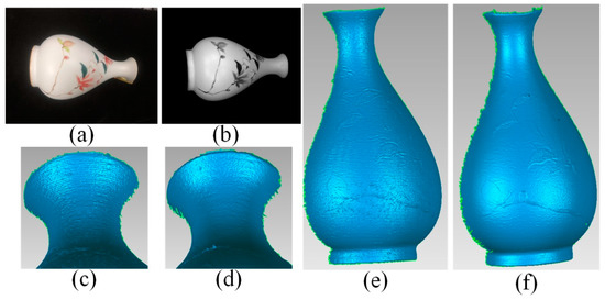As shown in Figure 10a, a vase with a colored texture was reconstructed. The diffuse component was first calculated and the visual albedo map was shown in Figure 10b. The reconstruction results and area enlarged by the method in [42] are shown in Figure 10c,e. Compared with our results in Figure 10d,f obvious unevenness near the texture caused by the colored texture can be observed. In addition, due to the ceramic material, wave-like unevenness can be observed as well. Our proposed method acquired more smooth results.