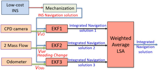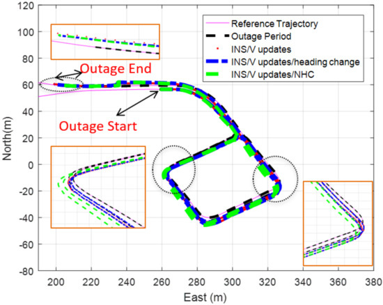 - Aftatah, M.; Lahrech, A.; Abounada, A. Fusion of GPS/INS/Odometer measurements for land vehicle navigation with GPS outage. In Proceedings of the 2016 2nd International Conference on Cloud Computing Technologies and Applications (CloudTech), Marrakech, Morocco, 24–26 May 2016; pp. 48–55. [Google Scholar] [CrossRef]