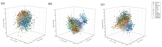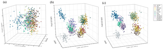 Three-dimensional plot of the first three principal components (PCs) for (a) morphological, (b) spectral and (c) morphological combined with spectral features dataset in 12 cultivars.