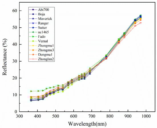 In general, the reflectance of seeds of 12 cultivars showed a similar trend in which the longer the wavelength, the higher the reflectance (Figure 3). However, the reflectance differed significantly among cultivars at each wavelength. For example, Fado had a significantly higher reflectance value in the spectral range from 365 to 780 nm than that of other cultivars, while showed a lower reflectance value in 850 to 970 nm compared to other cultivars in addition to Zhongmu1, Zhongmu3, Vernal, Dongmu 1 and Zhonglan2 (Supplementary Table S2). Seeds of 12 cultivars can be divided into 3 groups according to their light reflectance on 365 to 540 nm and 880 to 970 nm. Group one only includes Fado, Group two including Zhongmu1, Zhongmu3, Dongmu1 and Zhonglan2, and the group three including Abi 700, Boja, Marcrick, Ranger, Sutter uc-1465 and Vernal. Regarding uc-1465, Boja and Maverick, they showed a very similar reflectance pattern which has the lowest value from 365 to 540 nm, and the highest value from 780 to 970 nm.
