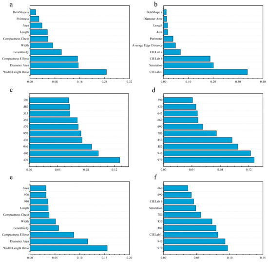 For the SVM model with morphology data (Figure 5b), the first five features, CIELab L* (33.76%), saturation (20.08%), CIELab b* (18.76%), CIELab a* (6.79%) and average edge distance (4.82%), accounted for 84.21% variation of the model, indicated seed color played an important role in cultivar discrimination. For spectral features (Figure 5d), 970 nm (12.77%), 940 nm (12.27%), 880 nm (10.48%), 850 nm (9.66%), 780 nm (7.45%) were first five features add up to 52.63% variation for SVM. For the combination of morphology and spectral data (Figure 5f), 970 nm (9.67%), 940 nm (9.29%), CIELab L* (8.19%), 880 nm (7.94%) and 850 nm (7.32%) were the first five features, accounting for 42.41% variation of SVM, suggesting that spectral and color features were more important for SVM classification.