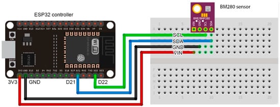 For data collection, an electronic circuit made up of an environmental sensor model BME280 [24] from Bosh and an controller model ESP32 [25] from Espressif Systems was designed, as shown in Figure 1.