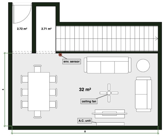The monitored space corresponds to the living room of a residential building. The monitored area is approximately 8 × 4 m and has mechanical ventilation: an AC unit, a ceiling fan, and sometimes, a floor fan. Furthermore, this space lacks windows and therefore has no natural ventilation.