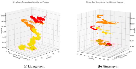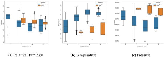 Figure 3 shows the distribution of humidity, temperature, and pressure grouped by location. In the case of the fitness gym, there is a tendency for humidity to decrease as occupation increases. For the case of temperature, similar behavior is observed but in the opposite direction, that is, the temperature tends to increase when the occupancy level also increases. Regarding pressure, the values are more dispersed, therefore, there is no clear relationship with respect to the occupation. On the other hand, in the case of the living room, the data behave in a similar way to the data collected in the fitness gym; however, lower average values are observed for humidity and higher average values for temperature. In the case of pressure, contrary to the fitness gym, a trend is observed in relation to occupation, i.e., as the occupancy increases on average, the pressure value decreases.