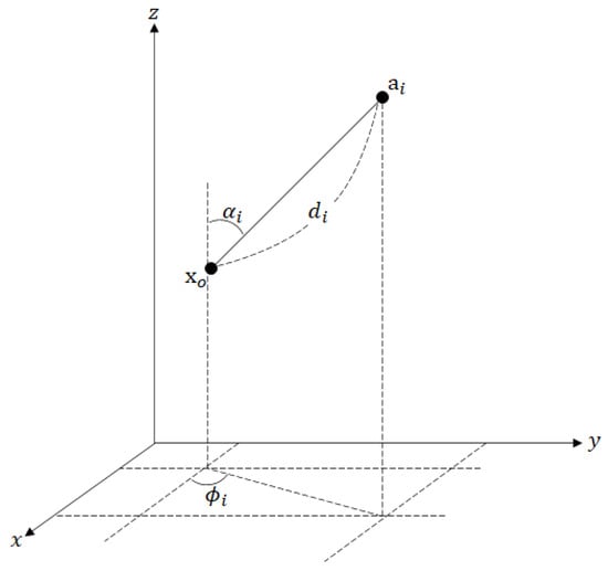 This section introduces the mathematical formulation of the hybrid target localization scheme utilizing both RSS and AOA measurements in WSNs. Let be the known position of the i-th sensor (anchor) node for and be the unknown location of the sensor (target). The target emits a signal; each node receives the signal from the target along the line-of-sight (LoS) path and measures the RSS, azimuth angle, and elevation angle to the target, which are denoted by , , and , respectively (Figure 1).