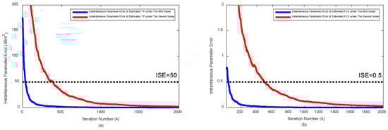 Parameter error vs. iteration under the mild noise ( dB, deg) and the severe noise ( dB, deg): (a) for TP, , and (b) for path-loss exponent (PLE), .