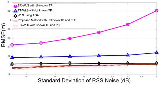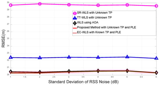 We compare the RMSEs of the proposed algorithm with those of the AOA-only algorithm based on EC-WLS (24), SR-WLS with unknown TP reported in [32], and TT-WLS (with unknown TP) reported in [33]. As a reference, the performance of the EC-WLS algorithm with known TP and PLE in [24] is also compared with that of the proposed algorithm.
