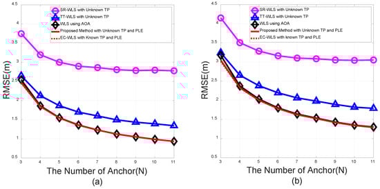 In practice, measurement noises typically feature inhomogeneous noise variance among the anchor nodes. Figure 5a presents a case with a small deviation in the standard deviation of the noise as the number of anchor nodes, N, increases; the measurement noises are modeled as uniform distributions over the nodes as ∼ (dB), ∼, and ∼ deg. Figure 5b depicts a case with a large deviation in the measurement noise variance as the number of anchor nodes, N, increases; (dB), ∼, and ∼ deg. In both cases, the proposed algorithm with unknown TP and PLE outperforms the AOA-only target localization method as well as the conventional hybrid methods with unknown TP.