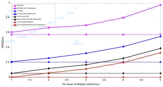 Figure 9 shows the simulation results under the basic measurement noise setting dB and with inverse Gaussian interference noise with the mean varying from 1 to 5 dB with fixed shape parameter (from 0.4 to 5 in terms of variance). As the mean of interference increases the RMSE performance of all algorithms are degraded in comparison with absence of interference (dotted line). However the proposed algorithm yields the best performance among existing TP/PLE estimating hybrid localization algorithms.