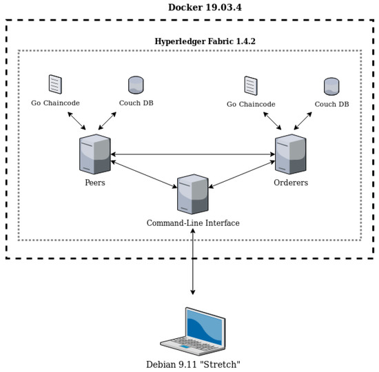The key focus of the work is to create a system that offers anonymity and security, and acceptable scalability. To this end, it was decided that multiple Docker containers, each incorporating a core element of Hyperledger Fabric’s network, would be operated in a host environment, as illustrated in Figure 2. In particular, a Debian Stretch host environment [38] manages a dockerized command-line interface (CLI) in order to set up a Hyperledger Fabric network consisting of peers and orderers that have installed the chaincode and the distributed Couch DB ledgers [14,15].