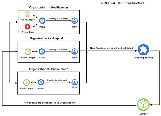 Effective encryption mechanisms were applied to successfully encrypt information; as a result, a malicious third party cannot access sensitive data. Furthermore, a blockchain ledger is invulnerable to specific command injection threats such as SQL injection, which targets a specific format of an information database [42]. Moreover, the MSP directory containing appropriate cryptographic material was mounted in each relative blockchain peer, thus rendering infeasible the exploitation of crafted cryptographic components by an attacker attempting to impersonate a blockchain peer and thus compromise the assembled network. Lastly, the implementation was associated with a private isolated blockchain topology, invulnerable to external security threats, where identified blockchain peers and orderers would directly reveal their identity in the case of ill-behavior. In the case of a permissioned private blockchain consortium that would use PREHEALTH, all validator identities are disclosed. Therefore, upon attempting to tamper with EHRs or blockchain transactions themselves, the actor (i.e., validator) would reveal their identity.