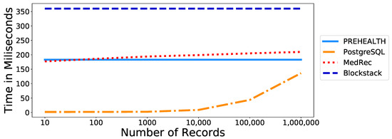 We calculated query times for PREHEALTH, as well as for a PostgresSQL database simulating a common EHR management solution, and for the MedRec and Blockstack experimentation prototypes for various volumes of EHRs (10, 100, 1000, 10,000, 100,000 and 1,000,000). The results are presented in Table 2 and in Figure 4. PREHEALTH demonstrates efficient Read and Write query time measurements while both blockchain solutions, namely Medrec and Blockstack, but also a traditional PostgreSQL database, impose higher overhead per query over time. Notably, PREHEALTH exhibits much better results when the number of records is large. As can be seen from the conducted tests, the transaction time for each Read query using a PostgreSQL database is rising linearly and is expected to overcome PREHEALTH at approximately 1,200,000 records. It is clear, then, that in a real-world scenario where there are millions of stored records, PREHEALTH can handle each query effectively and efficiently.