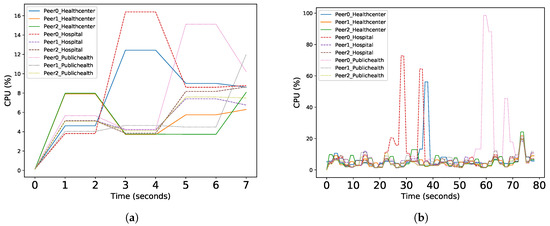 Furthermore, benchmark tests were conducted for the CPU and Memory performance of our proposed PREHEALTH solution. The CPU usage of PREHEALTH peers during the workflow for Read and Write queries over various volumes of EHRs (1000, 10,000, 100,000) is presented in Table 3 and Figure 5. As depicted in Figure 3, PREHEALTH introduced three organizations, namely Healthcenter, Hospital and PublicHealth. Each organization comprises three blockchain peers, respectively Peer 0, Peer 1 and Peer 2. The average CPU usage of the blockchain peers during Read queries is reasonable and less than 30%, whilst the CPU performance during Write queries is even lower, with a maximum of 15.4%. The CPU performance of the blockchain peers is regularly stable with swift fluctuations that are presumably caused by hardware limitations. The average memory overhead of each blockchain peer during our tests over various volumes of EHRs was insignificant (less than 2%); hence, it is not illustrated in a plot.