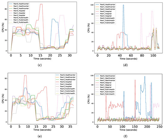 (a) Read queries workflow on 1000 Records. (b) Write queries workflow on 1000 Records. (c) Read queries workflow on 10,000 Records. (d) Write queries workflow on 10,000 Records. (e) Read queries workflow on 100,000 Records. (f) Write queries workflow on 100,000 Records. CPU Usage (%) of blockchain peers during workflow.